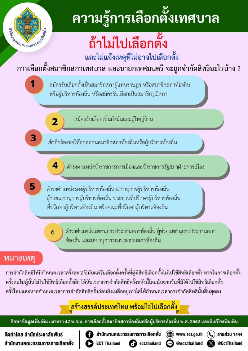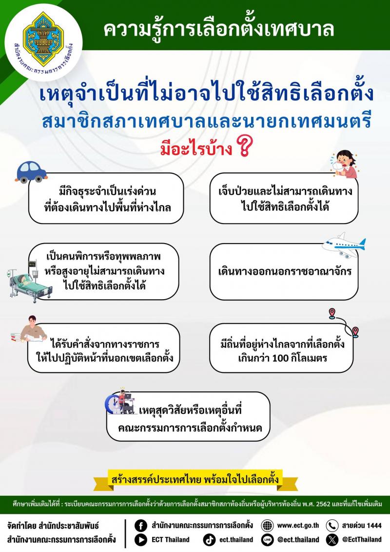 ความรู้การเลือกตั้งเทศบาล - ถ้าไม่ไปใช้สิทธิเลือกตั้ง สมาชิกสภาเทศบาลและนายกเทศมนตรี สามารถแจ้งเหตุผ่านช่องทางใดได้บ้าง ? - เหตุจำเป็นที่ไม่อาจไปใช้สิทธิเลือกตั้ง สมาชิกสภาเทศบาลและนายกเทศมนตรี มีอะไรบ้าง ? - ถ้าไม่ไปเลือกตั้งและไม่แจ้งเหตุที่ไม่อาจไปเลือกตั้ง การเลือกตั้งสมาชิกสภาเทศบาล และนายกเทศมนตรี จะถูกจำกัดสิทธิอะไรบ้าง ?