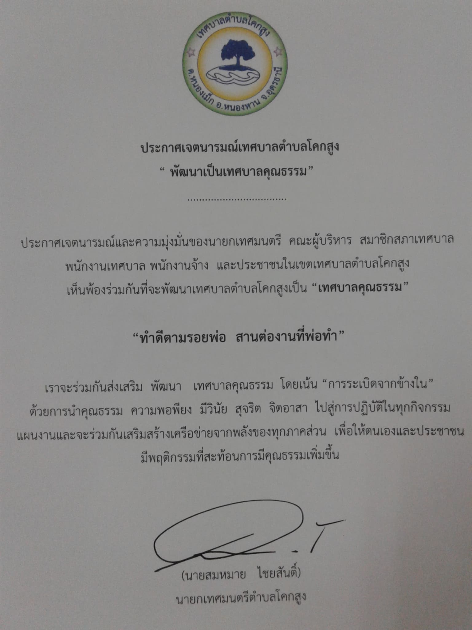 ประกาศเจตนารมณ์" พัฒนาเป็นเทศบาลคุณธรรม"