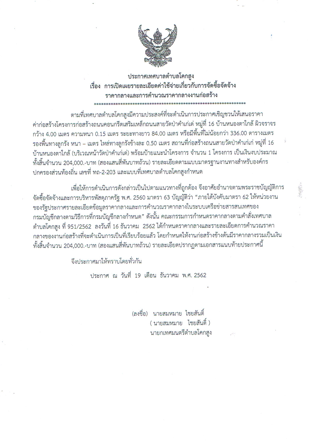 ชื่อเรื่อง : ประกาศเทศบาลตำบลโคกสูง เรื่อง การเปิดเผยรายละเอียดค่าใช้จ่ายเกี่ยวกับการจัดซื้อจัดจ้าง ราคากลางและการคำนวณราคากลางงานก่อสร้าง โครงการก่อสร้างถนนคอนกรี