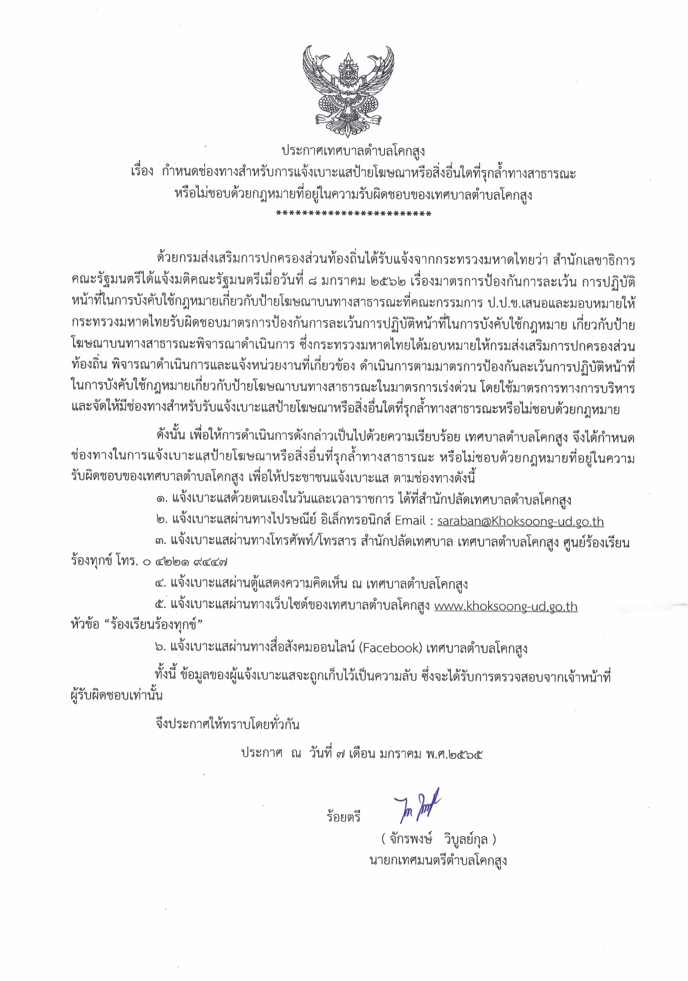 เรื่อง กำหนดช่องทางสำหรับการแจ้งเบาะแสป้ายโฆษณาหรือสิ่งอื่นใดที่รุกล้ำทางสาธารณะ