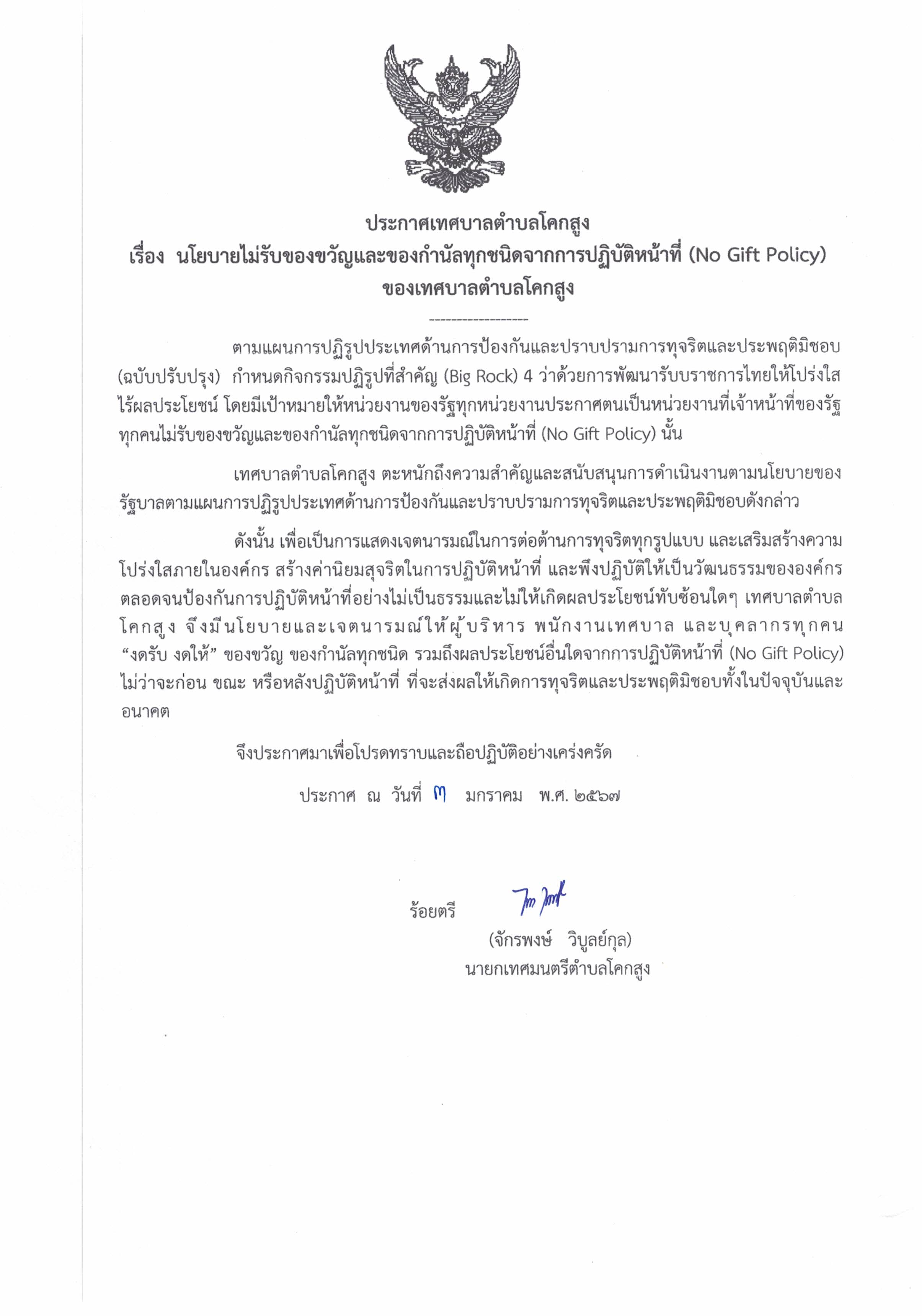 ชื่อเรื่อง : ประกาศเทศบาลตำบลโคกสูง เรื่อง นโยบายไม่รับของขวัญและของกำนัลทุกชนิดจากการผฏิบัติหน้าที่ (NO Gift Policy) ของเทศบาลตำบลโคกสูง