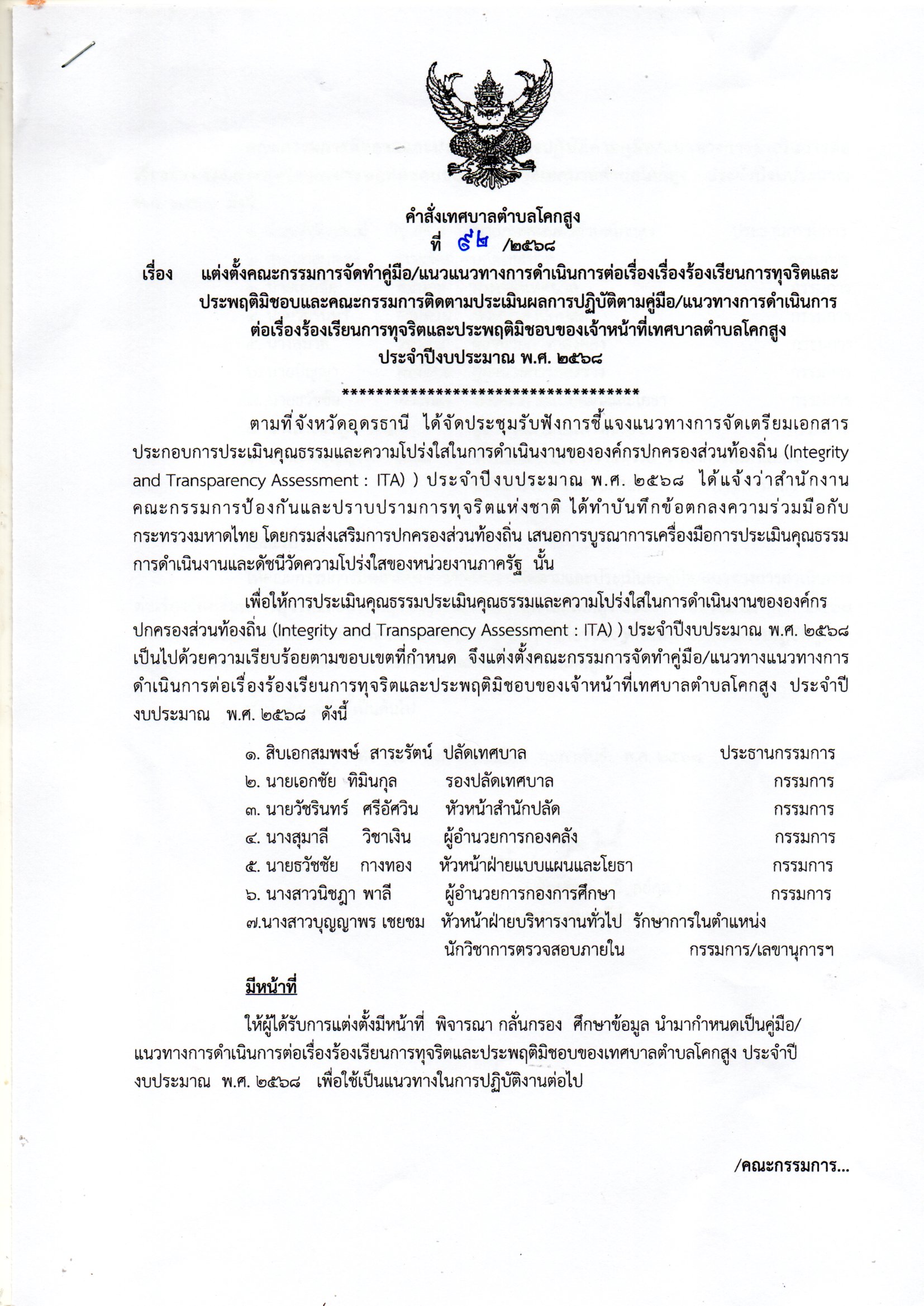 ชื่อเรื่อง : คำสั่งแต่งตั้งคณะกรรมการจัดทำคู่มือ/แนวทางการดำเนินการต่อเรื่องเรื่องร้องเรียนการทุจริตและประพฤติมิชอบของเทศบาลตำบลโคกสูง ประจำปีงบประมาณ พ.ศ. 2568