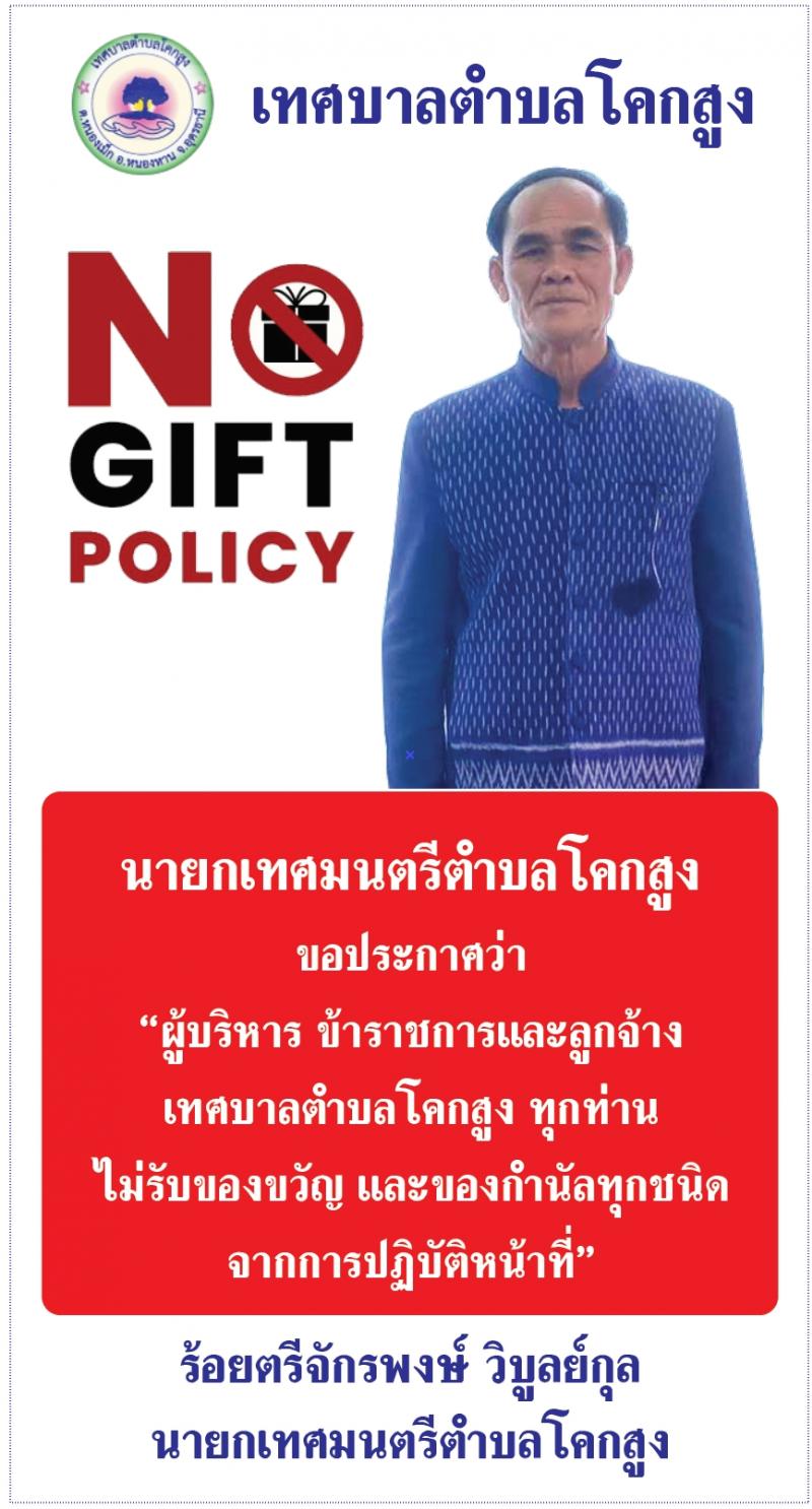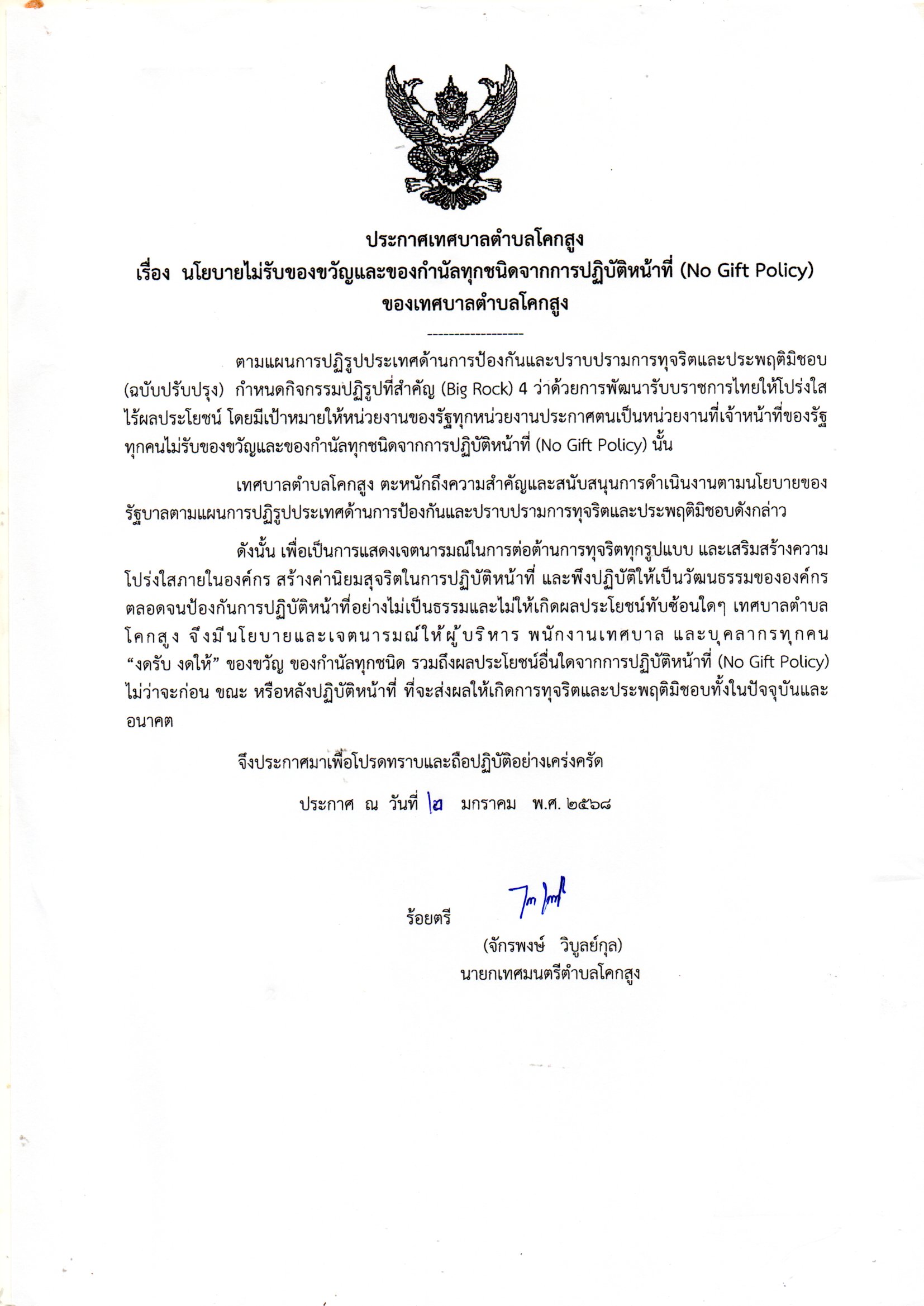 รายละเอียด : ประกาศเทศบาลตำบลโคกสูง เรื่อง นโยบายไม่รับของขวัญและของกำนัลทุกชนิดจากการผฏิบัติหน้าที่ (NO Gift Policy) ของเทศบาลตำบลโคกสูง