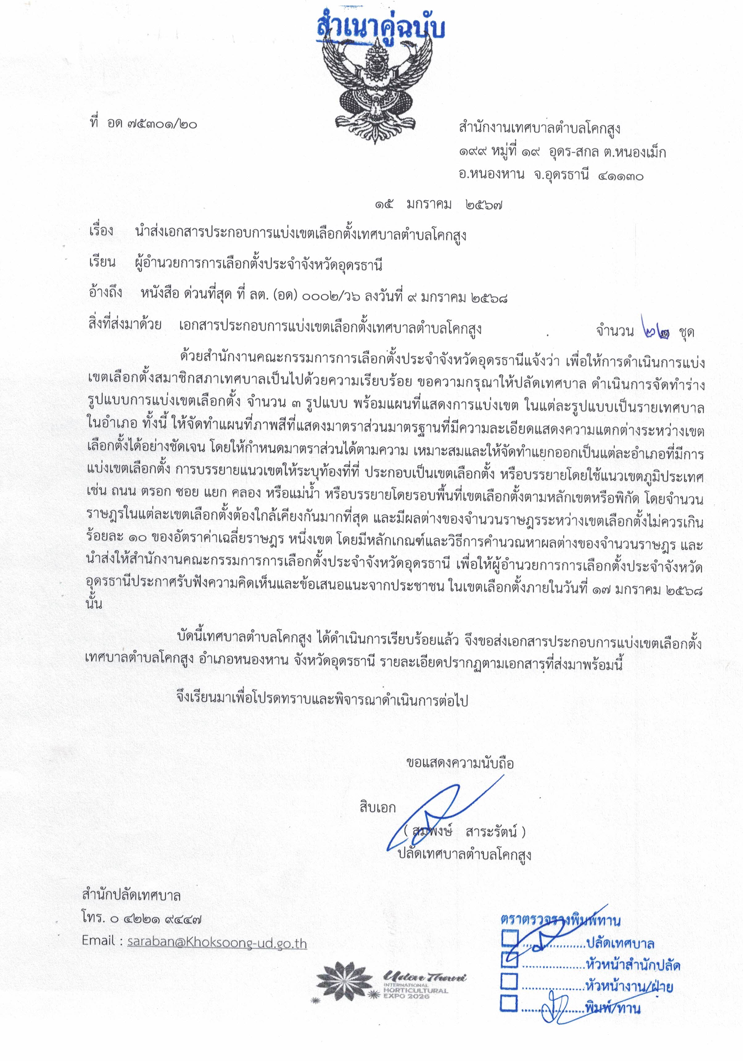 ที่ อด 75301/20 เรื่อง นำส่งเอกสารประกอบการแบ่งเขตเลือกตั้งเทศบาลตำบลโคกสูง