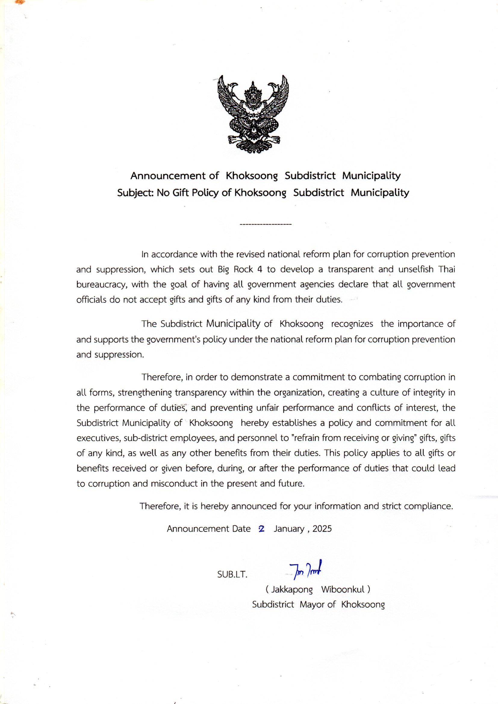 รายละเอียด : ประกาศเทศบาลตำบลโคกสูง เรื่อง นโยบายไม่รับของขวัญและของกำนัลทุกชนิดจากการผฏิบัติหน้าที่ (NO Gift Policy) ของเทศบาลตำบลโคกสูง